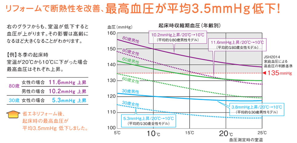 住宅の断熱化は快適性を向上させるだけでなく、様々な健康へのいい影響があることが報告されています。たとえば断熱改修の前後で最高血圧が平均3.5mmHg改善したという報告がされています。この他にも居間の室温が低い住宅では入浴事故が起きやすくなることなど指摘されています(国土交通省 スマートウェルネス住宅等推進調査事業)。
