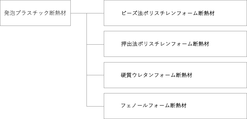 樹脂の種類や生産方式の違いなどにより、下図のようにビーズ法ポリスチレンフォームのほか押出法ポリスチレンフォーム、硬質ウレタンフォーム、フェノールフォームがあり、